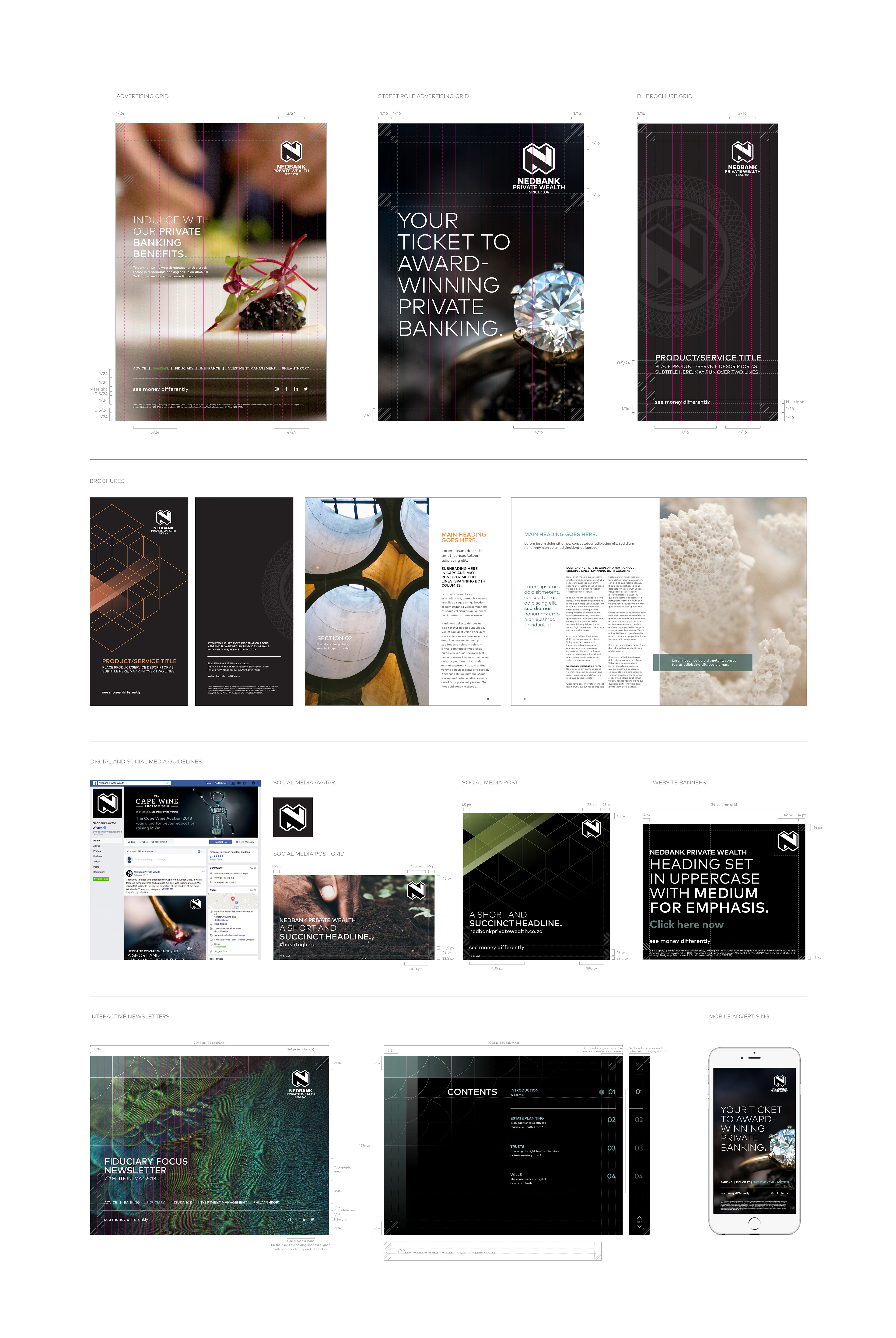 With a strong footprint in Africa Nedbank Private Wealth has a big global presence. To ensure consistency across the board both Nedbank and Nedbank Private Wealth collateral derives from the mother brand templates with the exception to the Nedbank green, which was replaced with black. This enhanced the brand to be more exclusive and sophisticated.